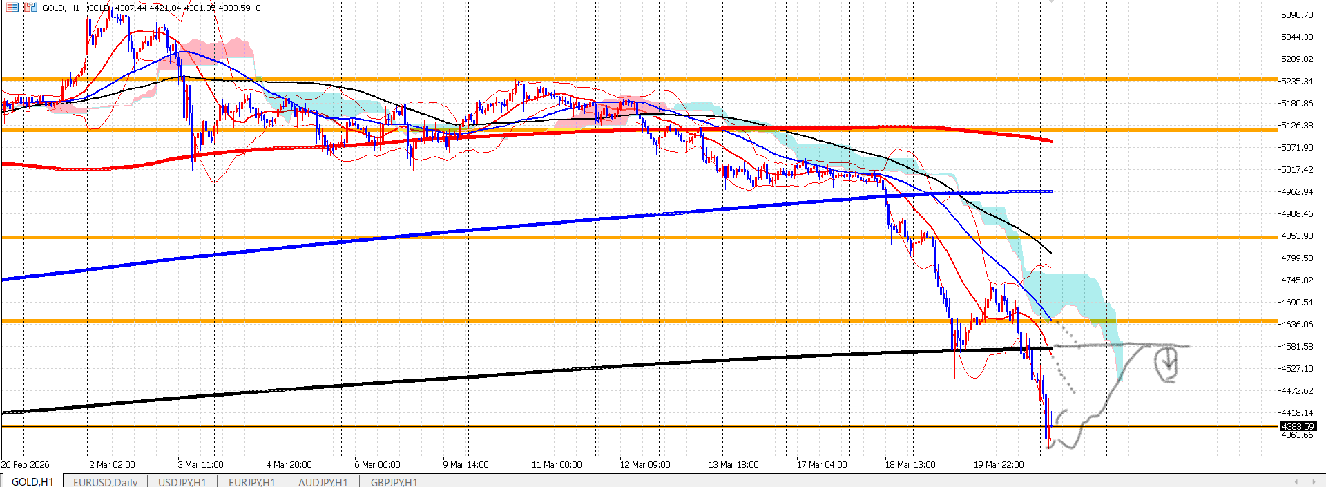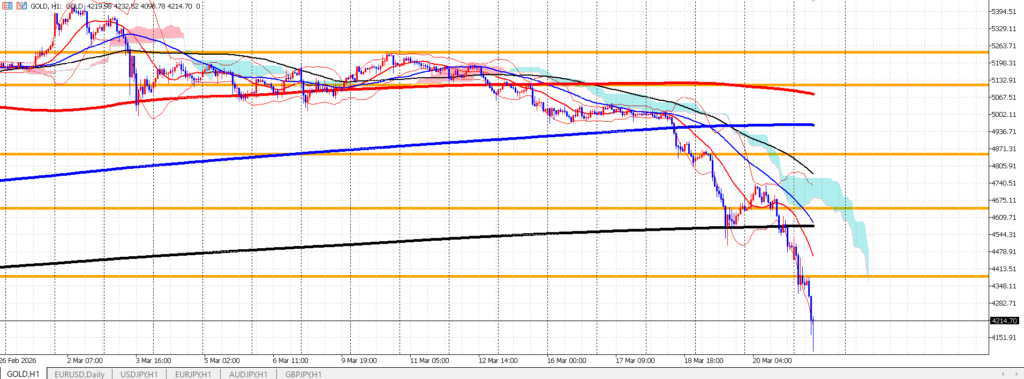 日足のパーフェクトオーダーを一気に抜け落ちていきました。1時間足では完全に下降トレンド形成しています。1時間足の50もしくは、日足の100あたりまで戻りをつけて下落が考えられる。