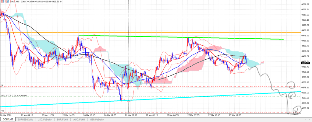 とりあえず、予約注文しておきます。しばらく観察してブレイクしそうな時は5分足でチャートパターンの確認していけそうなら予約続行、よくわからない場合はキャンセルします。