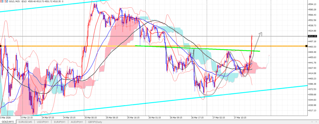 1時間足はレンジです。チャネルライン内をふらふらしています。チャネルライン内で三尊のような形を形成、チャネルラインの下を切ってブレイクチャンスとなりえるのでしょうか。その下にはレジサポラインがあります。