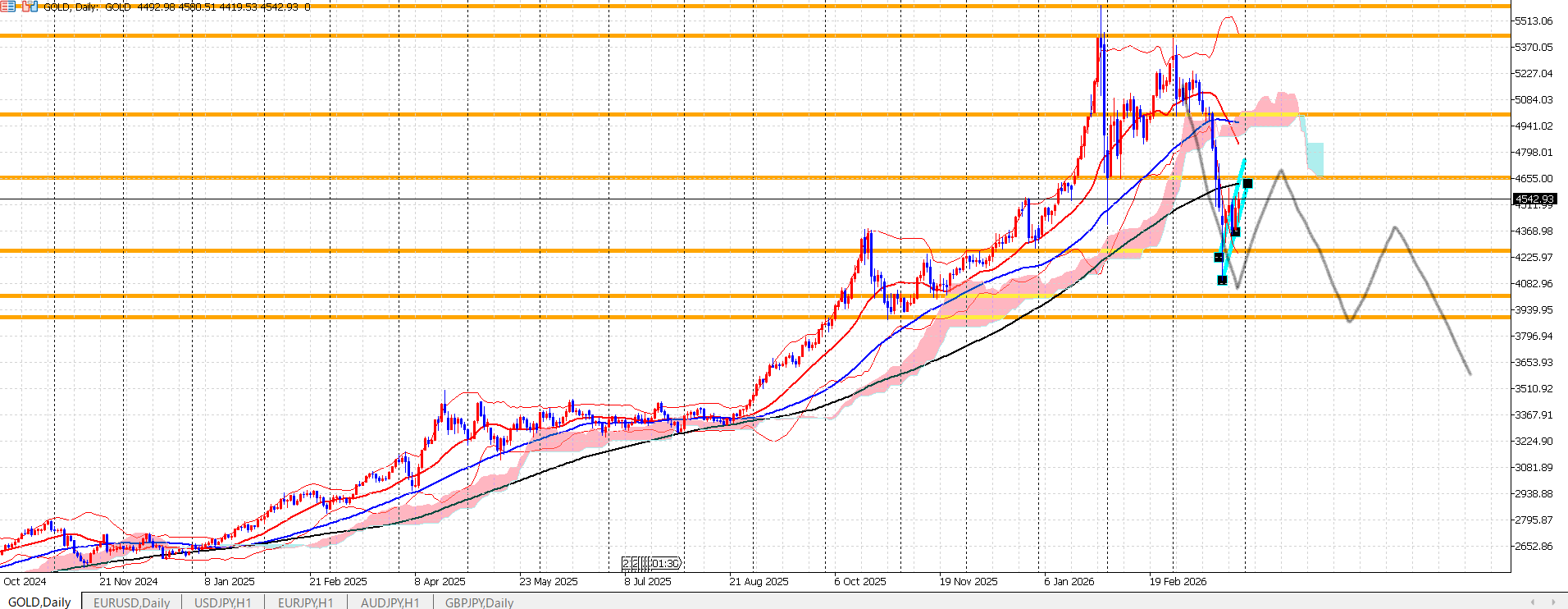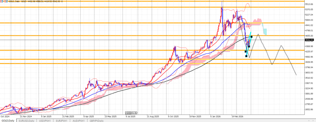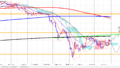 日足、上昇トレンドから高値更新できずに急落。その後の調整局面でまだまだ下落するか。日足100を超えるかどうかがポイントです。抑えられたら安値更新できるかどうか、100で押さえられて、安値更新できたらエントリーポイント。エントリーは5分足のチャートパターン次第です。