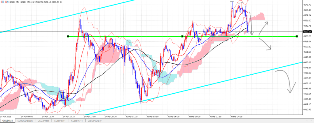 下降の勢いは収まり、フラッグのように見えます。このままチャネルラインに上値を抑えられたら下降の可能性が上がります。チャネルラインの下値を割って、戻り売りがエントリーポイント。5分足のチャートパターンで確認。