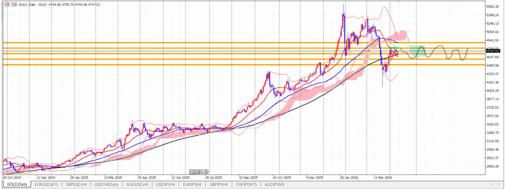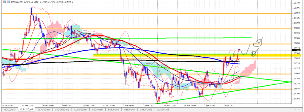 令和8年4月14日火曜日 Uncategorized X Facebook はてブ LINE Pinterest コピー 2026.04.15 目次 ゴールド環境認識11時★押し目買いエントリー★EURUSD11時30分 ゴールド 環境認識 通貨指数…CHF>GBP>EUR>USD>JPY 転換期 日足100はまだ上向き 厚めの下降雲 スクイーズへ 11時★押し目買いエントリー★ EURUSD 11時30分